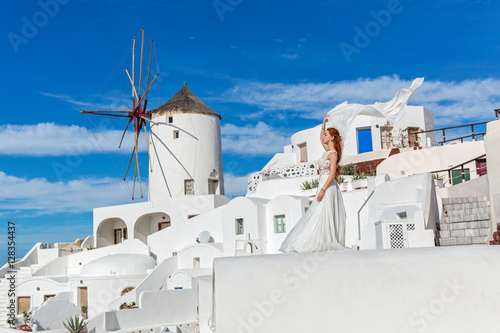 © Santorines, Fototapeta premium Beautiful woman in white dress