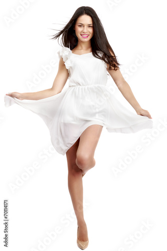 © czamfir, Naklejka premium Beautiful woman in white dress on white