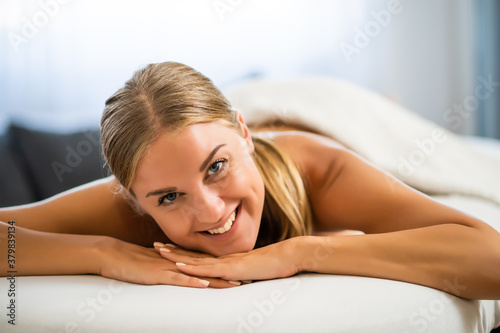Fototapeta premium Beautiful woman is relaxing massage at her home. Stress relief after work.