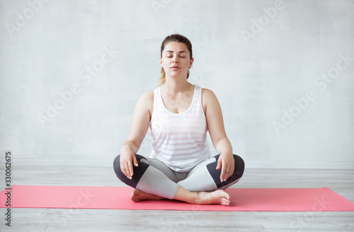 © Amelia Fox, Fototapeta premium Beautiful woman is sitting on yoga mat in half lotus pose