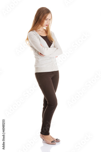 © Piotr Marcinski, Fototapeta premium Beautiful woman is standing, lookis sad, with her hands crossed.
