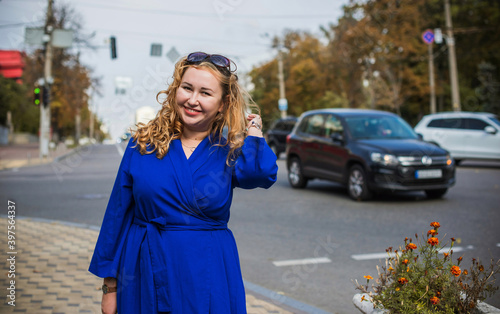 Fototapeta premium Beautiful woman on a walk in the city. Autumn- Winter time. A nice middle aged plus size woman at the street. Citizen lifestyle