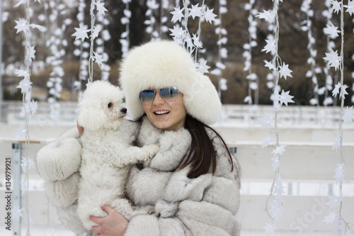© Addoro, Obraz premium Beautiful woman playing with her dog outdoors. Winter time. Playing with the dog at the park. Woman wearing a white fur coat. Christmas decorations in the background.