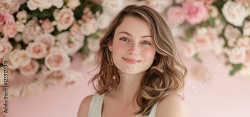 Fototapeta premium Beautiful Woman Portrait with Pink Roses Background