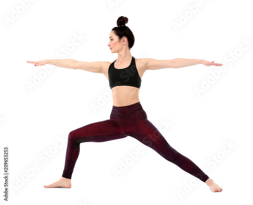Fototapeta premium Beautiful woman practicing yoga on white background