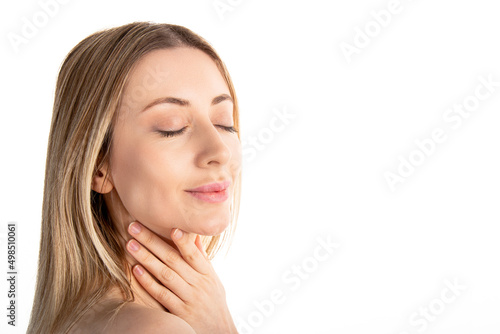 Fototapeta premium Beautiful woman shoulder cropped portrait with copy space.