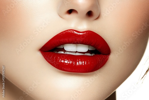 © yogiandrias, Obraz premium Beautiful woman showing her lips with bright red glossy lipstick