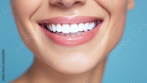 © Moli, Obraz premium Beautiful woman smiling with perfect white teeth on a blue background)