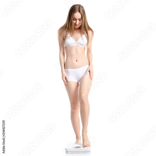 © Kabardins photo, Fototapeta premium Beautiful woman standing on weighing scale centimeter weight loss on white background isolation