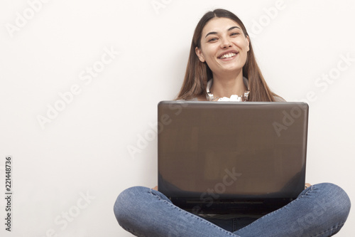 © izzetugutmen, Naklejka premium beautiful woman student using laptop computer
