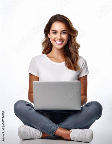 Fototapeta premium Beautiful Woman Using Laptop Isolated on White Background