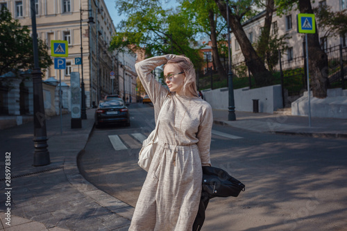 Fototapeta premium Beautiful woman walks through the streets of Moscow
