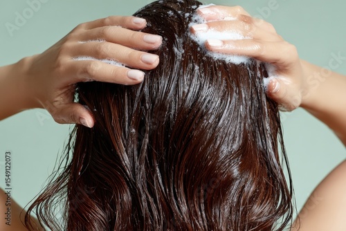 © The Little Hut, Naklejka premium Beautiful woman washing her long brown hair with shampoo in a bathroom with water and bubbles, personal hair care and hygiene routine