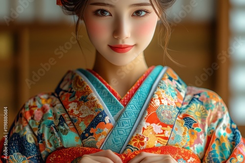 Fototapeta premium Beautiful woman wearing a colorful kimono in a traditional setting showcasing Japanese culture and elegance