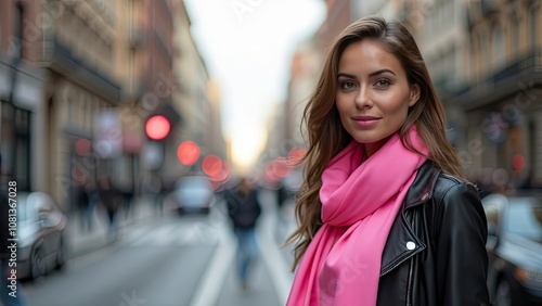 Fototapeta premium Beautiful woman wearing pink scarf and black leather jacket in city