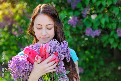 © timonko, Fototapeta premium beautiful woman with a bouquet walking in the garden