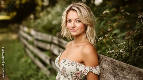 © Pichapob, Naklejka premium Beautiful woman with blonde hair posing near wooden fence in nature