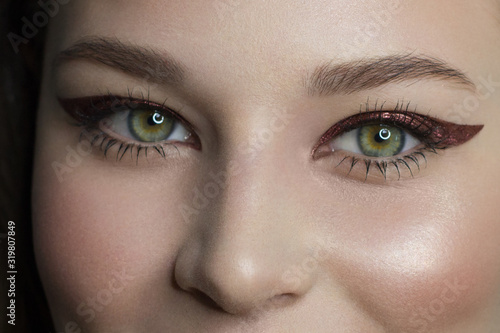 © evgeniyasht19, Fototapeta premium Beautiful woman with bright make up eye with sexy red liner makeup. Fashion big arrow shape on woman's eyelid. Chic evening make-up. Luxurious extremely long eyelashes. Shining face skin