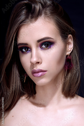 Fototapeta premium Beautiful woman with bright multicolor celebration make up Chic evening make-up. Fashion retouched portrait.