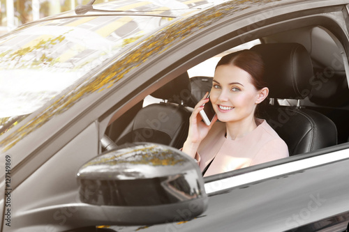 Naklejka premium Beautiful woman with cellphone driving a car