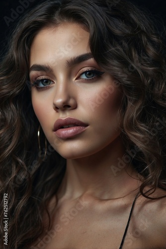 © alexx_60, Fototapeta premium Beautiful Woman with Dark Hair: Perfect Makeup and Seductive Facial Features