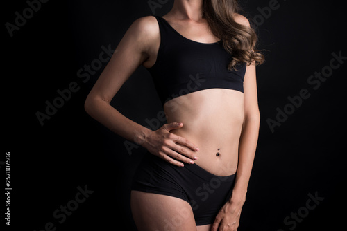 © Johnstocker, Fototapeta premium Beautiful woman with healthy body on black background