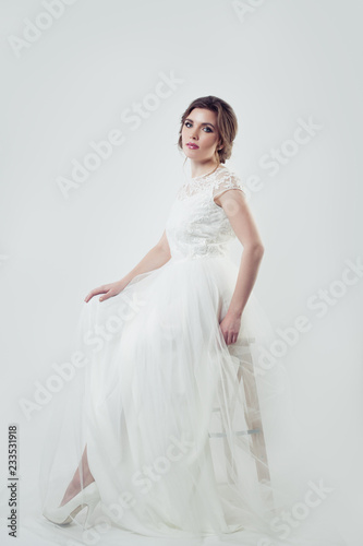Fototapeta premium Beautiful woman with makeup and bridal hairstyle wearing white dress