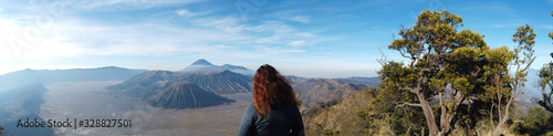 Obraz premium Beautiful woman with red hair watching over Mt Bromo volcano in Java Indonesia