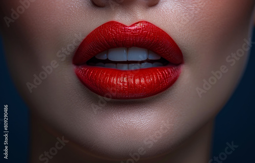 Fototapeta premium Beautiful woman with red lips on dark background