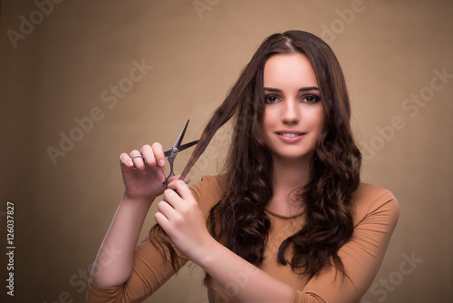 Obraz premium Beautiful woman with scissors cutting her hair