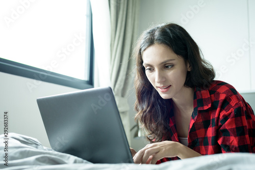 Fototapeta premium Beautiful woman working on a laptop with smiling and lying down on the bed at...