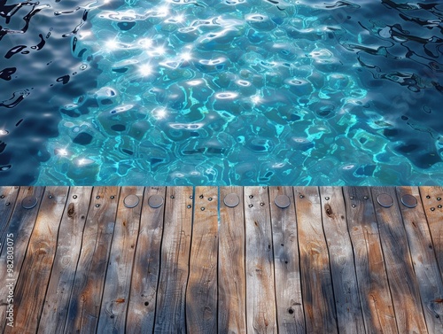 © Suradet Rakha, Obraz premium Beautiful wooden background with water in a swimming pool, top view. Summer vacation concept.