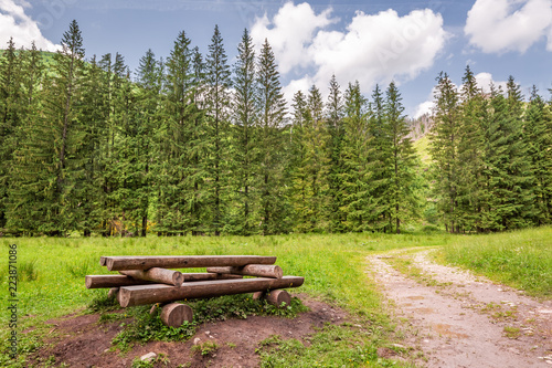 Fototapeta premium Beautiful wooden bench in Koscieliska valley in Tatra Mountains