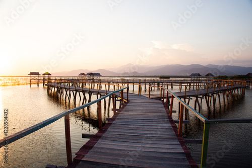 Obraz premium beautiful wooden bridge on the beach at sunset