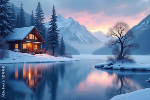 Fototapeta premium Beautiful wooden cabin glowing with warm lights, surrounded by snowy pine trees and mountains. Set by a serene frozen lake with reflections at sunset. Perfect for winter and travel concepts.
