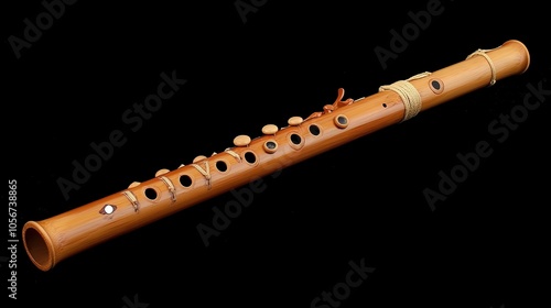 Naklejka premium Beautiful wooden flute, crafted from rich timber, showcasing intricate detailing and a polished finish. Ideal for musicians and collectors, this instrument embodies traditional craftsmanship