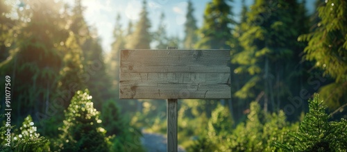 Fototapeta premium Beautiful wooden road sign in a serene forest setting with blue sky conveys a...