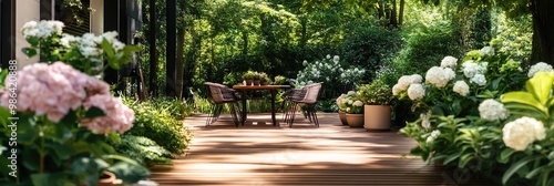 Obraz premium Beautiful wooden terrace with a table and chairs surrounded by lush greenery