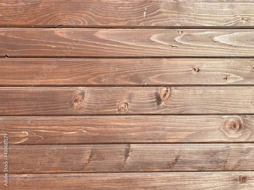 Fototapeta premium Beautiful wooden texture of horizontal multi-colored boards with knots on a brown wall surface. The background. Texture