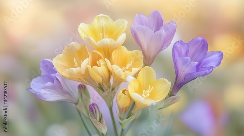 Fototapeta premium Beautiful Yellow and Purple Freesia Flowers in Soft Focus Background