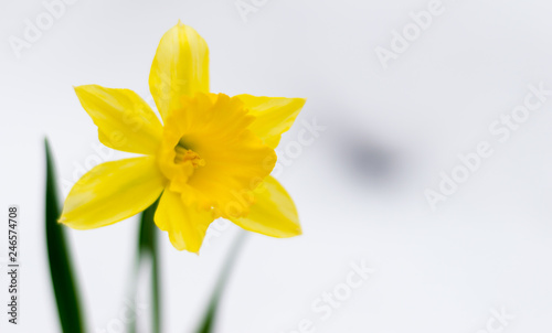 Fototapeta premium Beautiful yellow blossoming narcissus bursts out of the white snow in winter