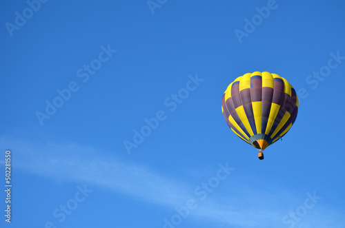 © Viktoriia Kolosova, Fototapeta premium beautiful yellow blue hot air balloon against the blue sky, copy space