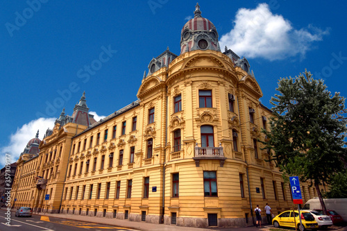 © Khaleel, Fototapeta premium Beautiful yellow building in downtown Zagreb, Croatia