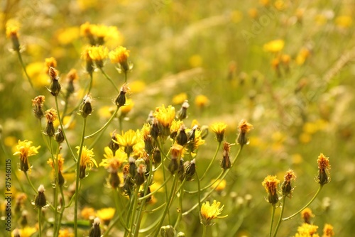 Obraz premium Beautiful yellow flowers blooming in field, closeup