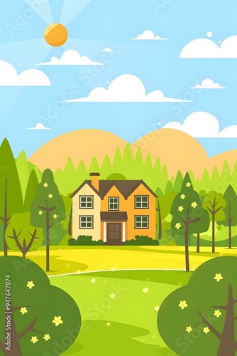 © Adobe Contributor, Fototapeta premium Beautiful Yellow House with Green Trees and Blue Sky Illustration