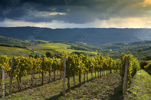 © Dan74, Naklejka premium beautiful yellow rows of vineyards in autumn at sunset. Chianti Classico Area near Panzano in Chianti (Florence). Italy.
