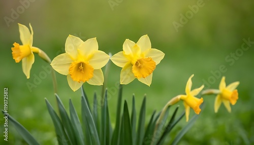 © Mehbubakhatun, Fototapeta premium Beautiful Yellow Spring Blooms on Blurred Green Background. 10