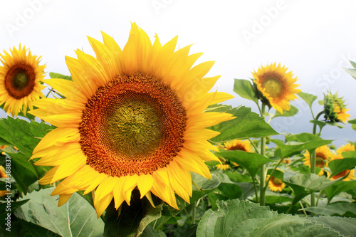 © yarbeer, Fototapeta premium Beautiful yellow sunflower against sky close up