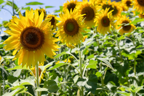 © 201122, Fototapeta premium Beautiful yellow sunflowers are blooming. Blue sky.