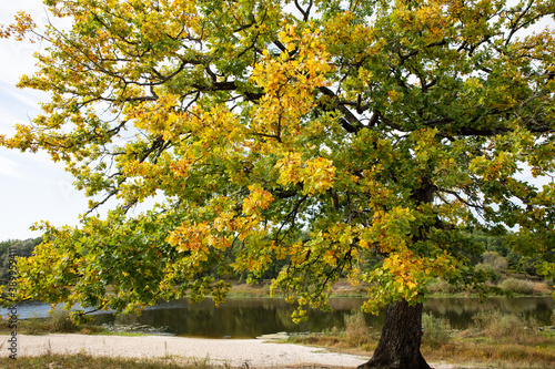 Naklejka premium Beautiful yellowed foliage and acorns of oak in autumn.